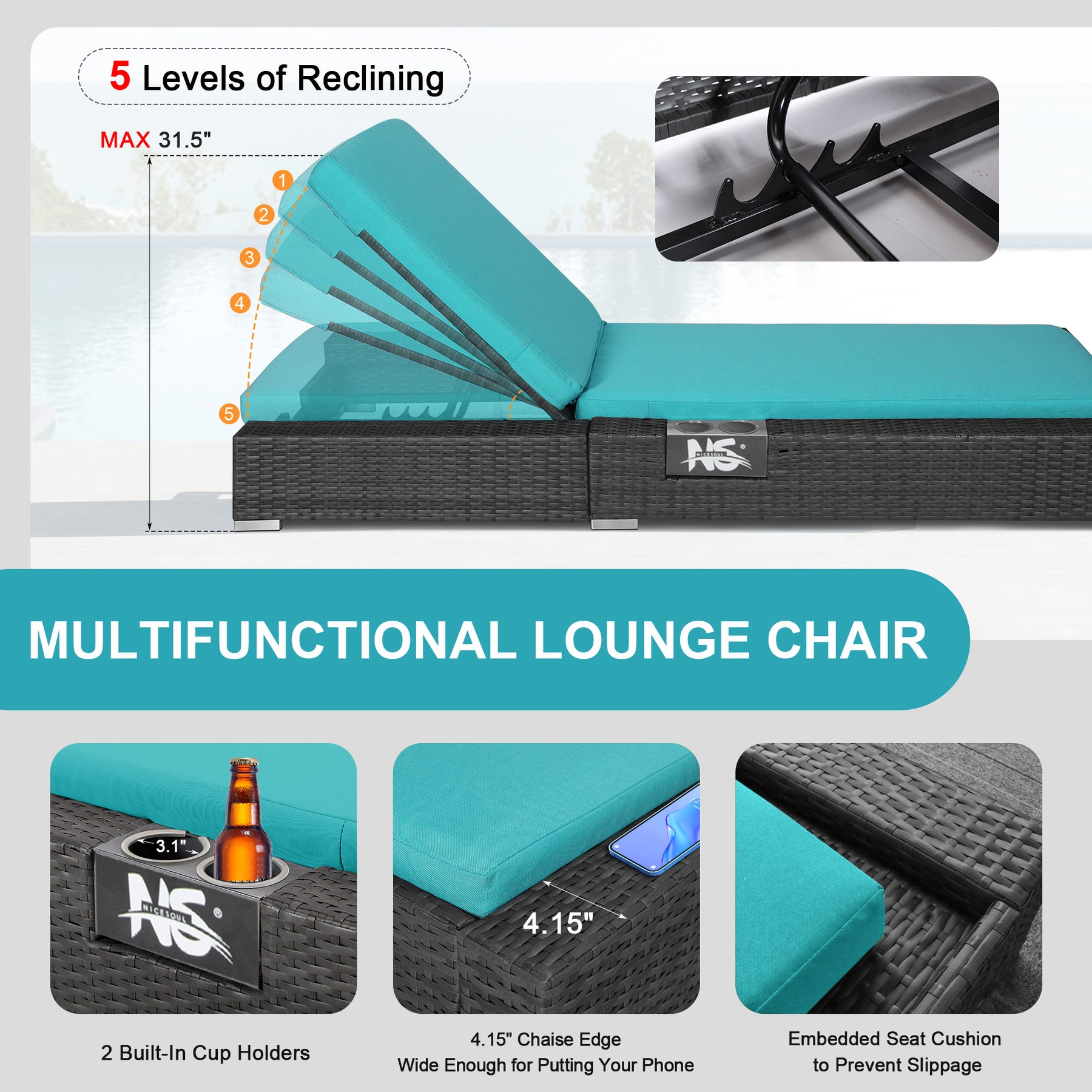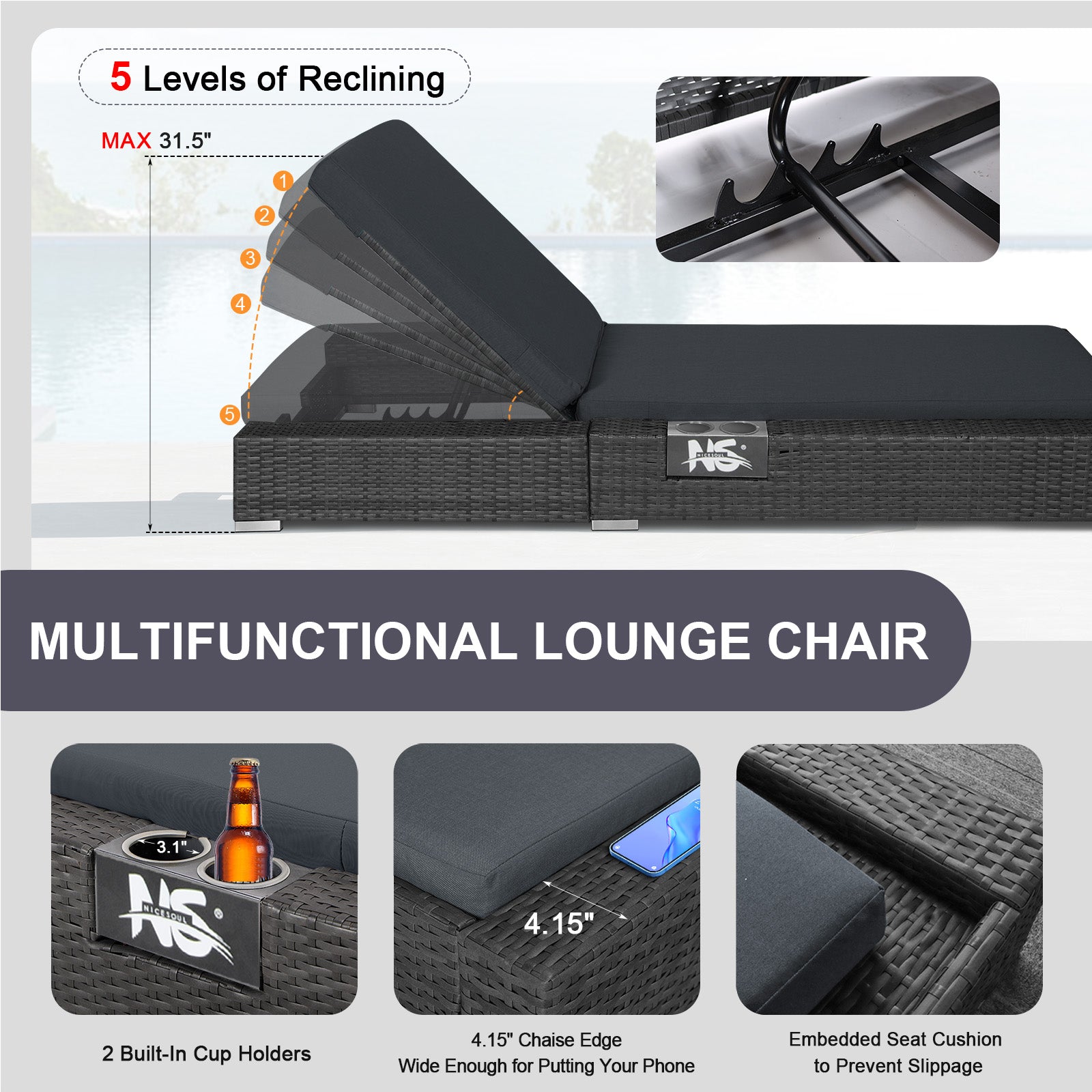 - 〖Adjustable Back Height〗:The back of this patio wicker chaise has 3 ergonomic recline positions that can be adjusted from bottom to top for maximum comfort to meet your different needs, and there is an alcove on the side of the chair to hold wine glasses and bottles while you sunbathe, brilliant!